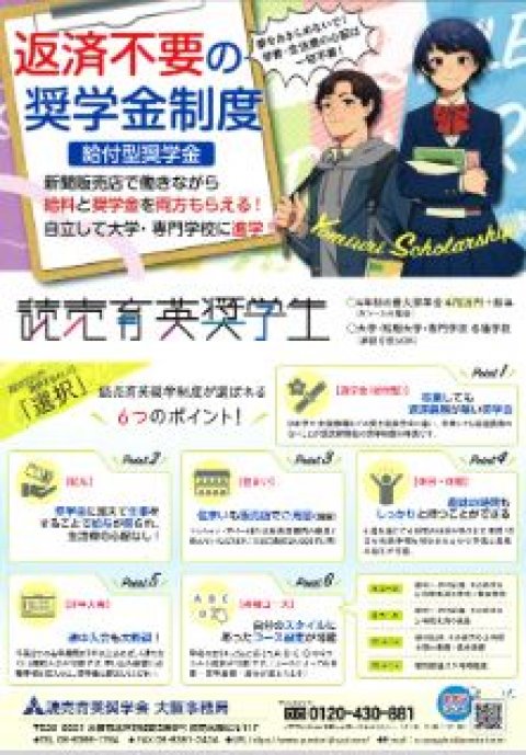 新聞の朝・夕刊配達、集金、チラシの折り込みなどの業務に就きながら、近畿地方と岡山県・広島県・四国の大学・専門学校・予備校などに通う奨学生制度です。完全給付の奨学金や年2回の特別奨学金を学費に充当し、生活費は読売新聞販売店から支給される給与でまかないます。